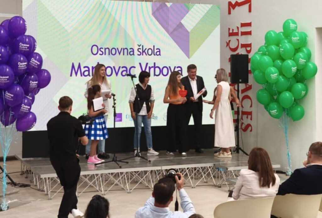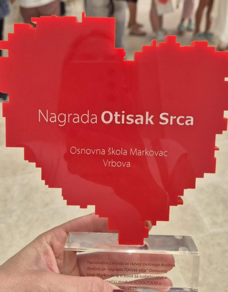 Učenici 7. razreda osnovne škole Markovac, Mia Štefanac, Sara Sabljak i Dominik Ružojčić, u pratnji nastavnice hrvatskog jezika Žakline Ruškan i pedagoginje Marije Balind sudjelovali su na svečanoj dodjeli nagrada za sudjelovanje u hrvatskoj inačici projekta sCOOLFOOD – Činimo dobro otiskom srca.