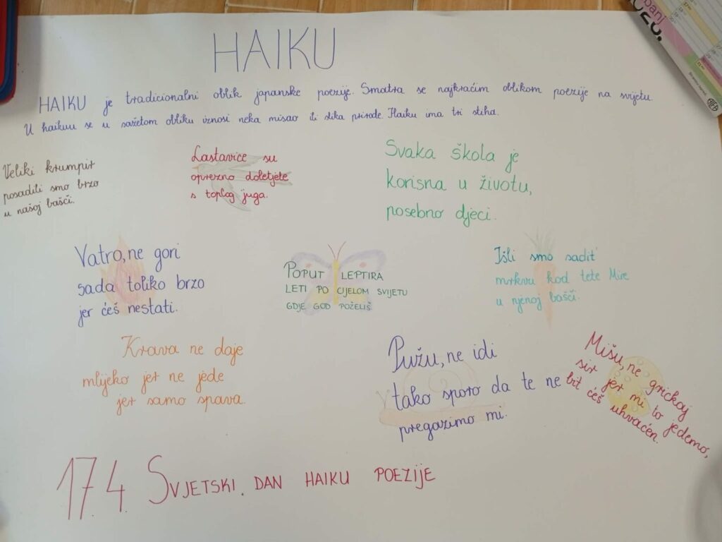 U Područnoj školi Komarnica 17.4. 2026. obilježen je Svjetski dan haiku poezije. Haiku pjesma je japanska pjesma koju obilježava posebna forma koju čine 3 stiha i to idealne dužine 1.stih 5 slogova, 2.stih 7 slogova i 3.stih 5 slogova. Cilj je ovakve pjesme izreći vlastitu misao ili pjesničku sliku, a da se stihovi pri tome ne moraju rimovati. Bilo je u početku zbunjujuće, ali kad je napisana prva, ostale su bile lake. Učenik Filip Klarić potrudio se i osmislio ih čak 9.